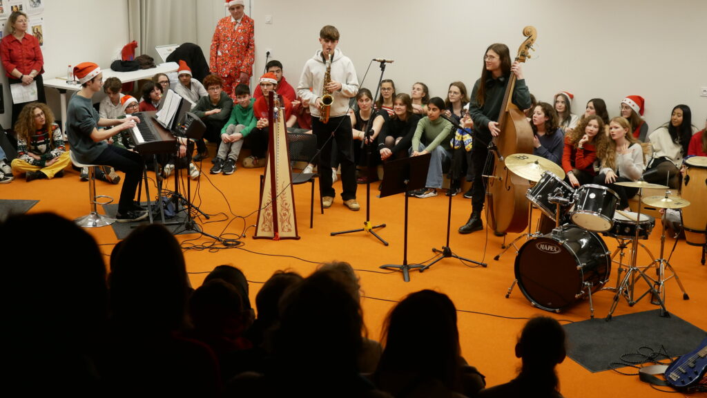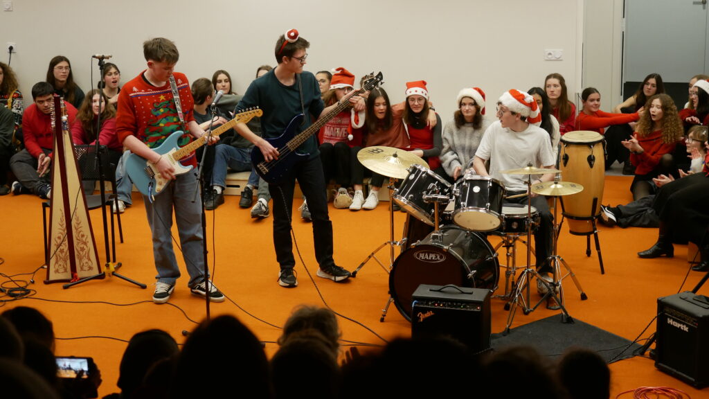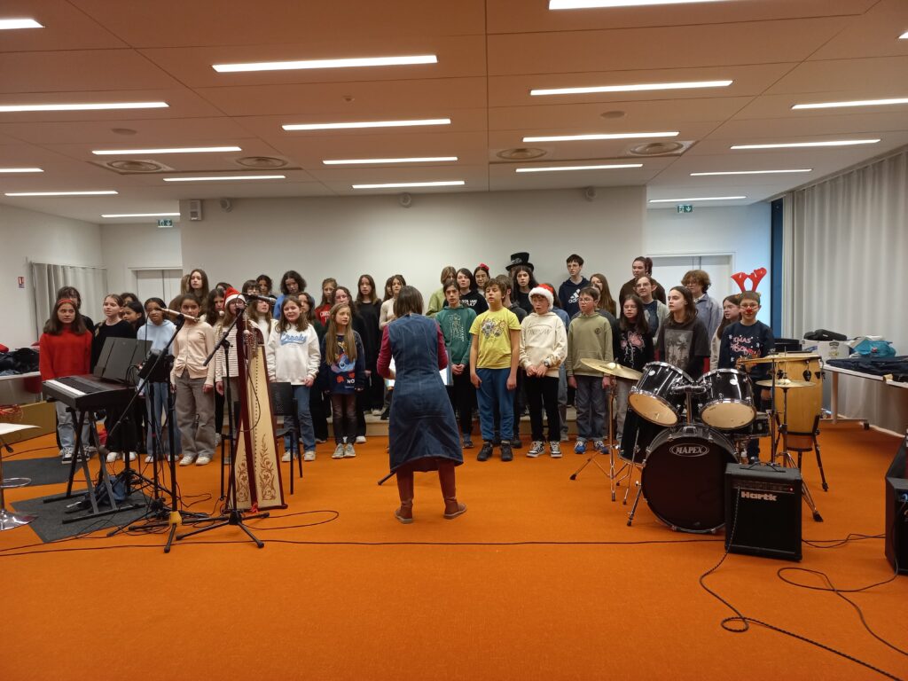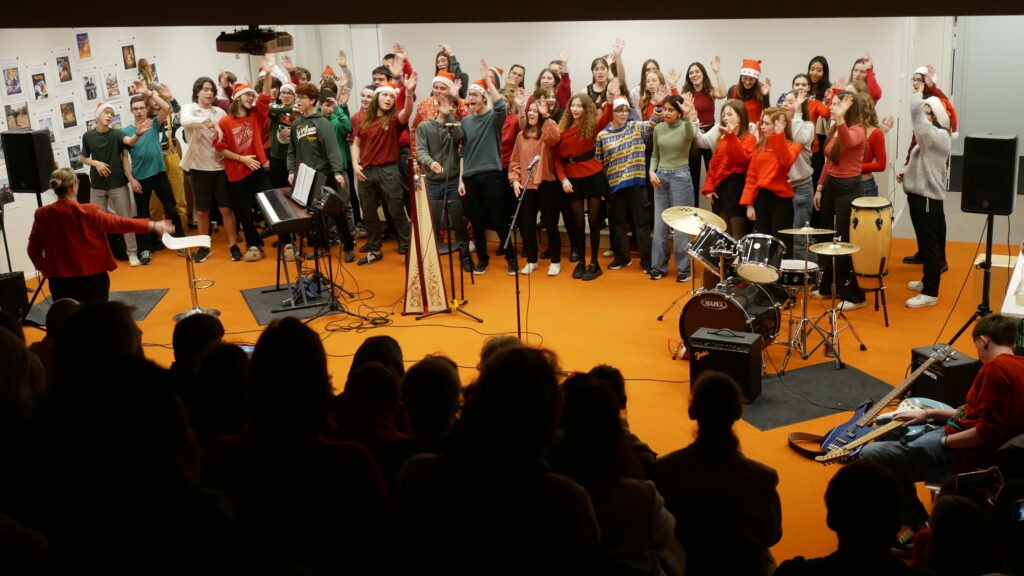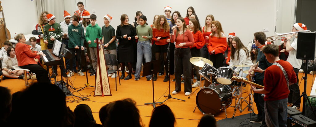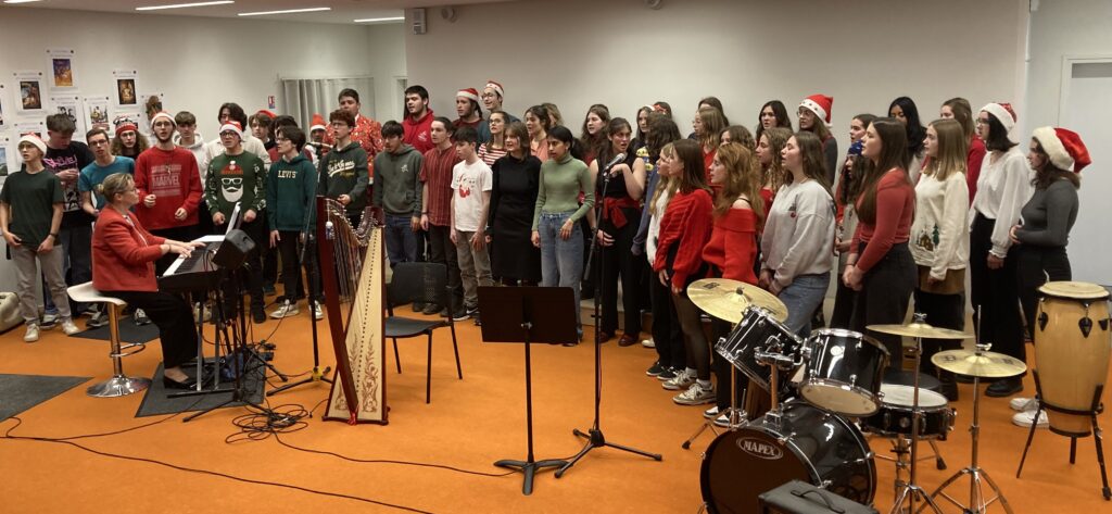 * Dernier jour de cours : Moments de partage par classe et en chorale dans la salle de musique décorée pour Noël.