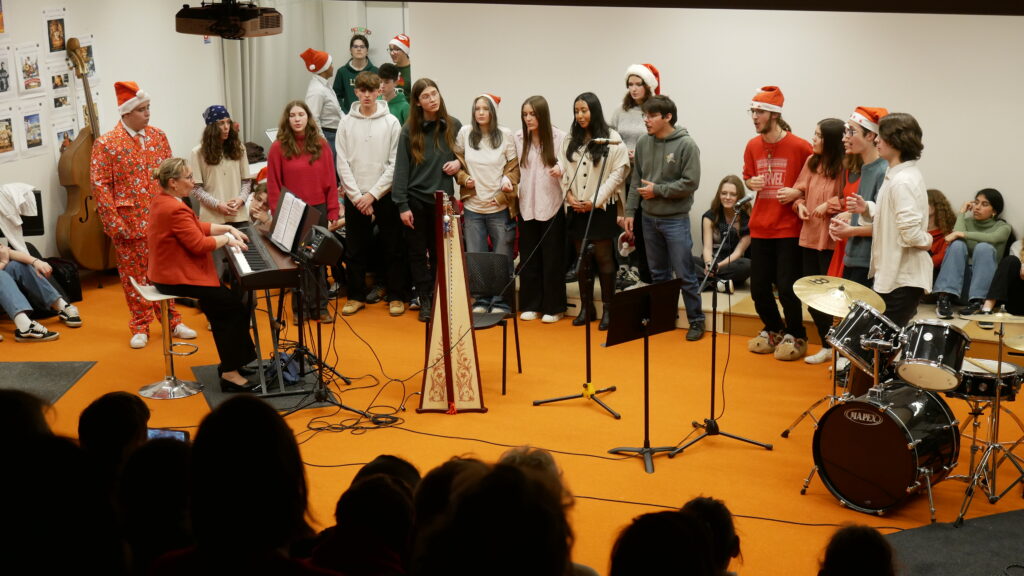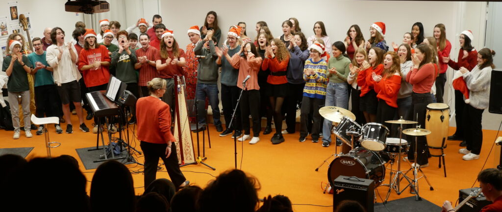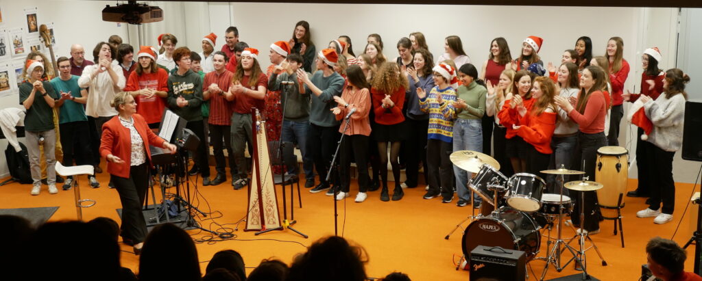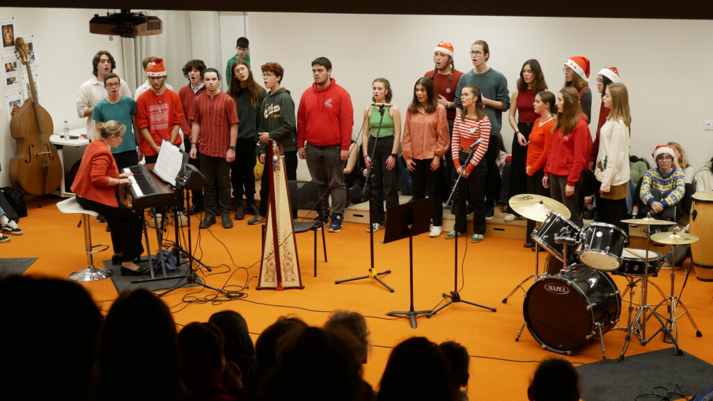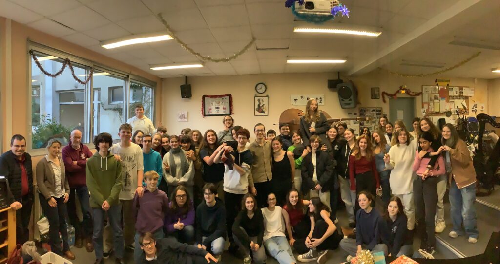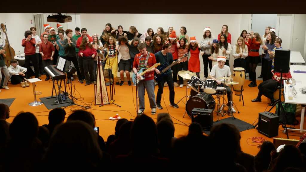 * Dernier jour de cours : Moments de partage par classe et en chorale dans la salle de musique décorée pour Noël.