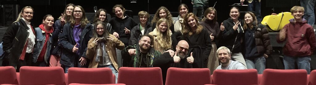 – Anaïg : « J’ai été très agréablement surprise par cet atelier autour de Blockbuster ! Tout d’abord, les musiciens et comédien-ne-s étaient très sympathiques et répondaient avec plaisir et intérêt aux questions posées. Une atmosphère conviviale s’est rapidement installée sur scène malgré le nombre important d’élèves que nous étions. Ensuite, la découverte était totale pour la plupart d’entre nous . C’était passionnant d’être plongé au cœur d’un univers inconnu : le bruitage, mais aussi tous les autres aspects cinématographiques et musicaux. De plus, les échanges entre élèves et artistes étaient très enrichissants, notamment concernant leurs parcours et le cheminement de leurs idées. J’ai particulièrement aimé leur démarche, aussi bien l’opposition entre le grand cinéma Hollywoodien et leur interprétation sonore beaucoup plus « artisanale », que l’histoire qu’ils ont choisi de raconter. J’ai également adoré leur simplicité et leur spontanéité, par exemple en proposant à des lycéens d’essayer des effets de bruitages… on a ainsi pu se rendre compte que c’était tout un métier ! Enfin, j’ai aimé non seulement l’aspect instructif de cet atelier, mais aussi son côté ludique. Je pense que cet échange m’a permis de mieux apprécier le spectacle le soir même, et de porter plus d’attention aux détails qui pouvaient nous échapper. Je finirais ce retour d’expérience en remerciant le Carré Magique et Mme CAM à l’initiative de cette rencontre, et bien évidemment les 5 musiciens et comédien-ne-s, qui nous ont consacré de leur temps avec autant d’enthousiasme ! »