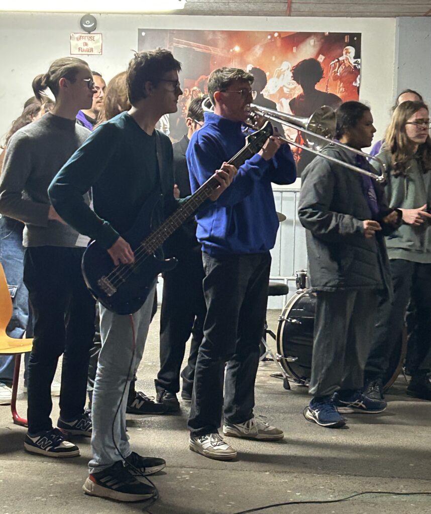 – moments d’improvisation autour de « C Jam Blues » associant des élèves de secondes et de terminales : avec Louis (trombone), Martin (guitare), Maxime (Basse) & Maud (Batterie), Oscar (clarinette basse), Maëlan (saxo) & Rafaël (piano)