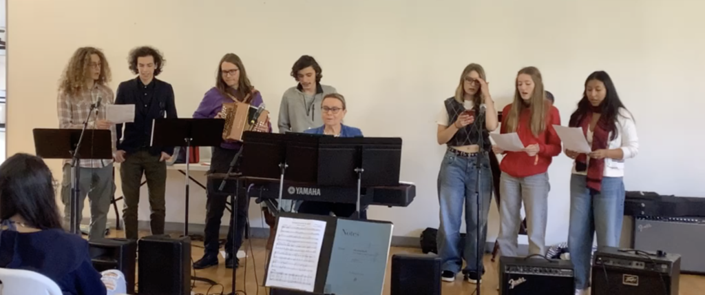 – Le plaisir créatif : répartis en équipes de 8-10 choristes (tous niveaux confondus), le but pour les élèves était d’inventer des paroles sur la chanson très connue « Laissons entrer le soleil » (paroles des couplets inventées en cohérence avec le Refrain), puis d’interpréter et de s’approprier cette chanson en équipe.
