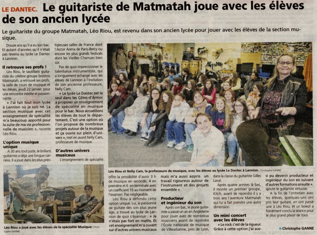 Jeudi 22 Janvier : Léopold Riou, ancien élève de spécialité Musique, actuel guitariste du groupe Matmatah, rencontre les élèves de l’option Musique.